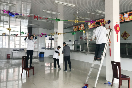 后勤工人裝飾校園,營造濃濃的節日氛圍