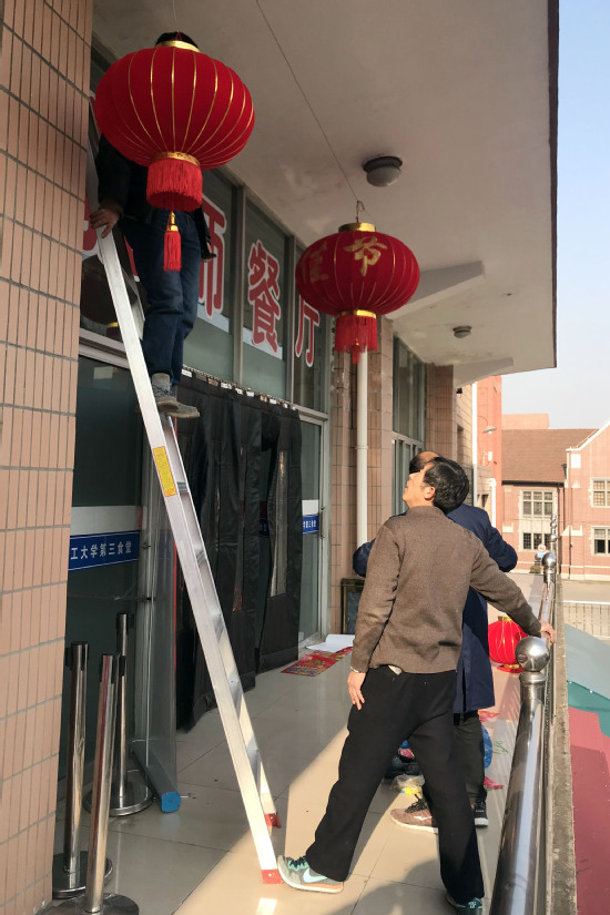 “貼上窗花、掛上燈籠,紅紅火火的,這樣看起來才有一個過年的樣子嘛,我自己也有孩子,但是留校過年的這些孩子更需要我來照顧,他們雖然留在學校過年,也要讓他們有在家過年的感覺”,四公寓四號樓的宿管阿姨李玉林一邊貼著窗花,一邊笑著講到。宿舍對于學生來說就是自己的第二個家,為了讓留校過年的同學們也能夠感受到家的溫暖和過年的氛圍,學校相關部門在環境氛圍營造上下功夫,在學生寢室樓和食堂貼上窗花、掛上對聯,在校門口和校園里掛上燈籠,給校園增加了濃濃的年味兒。