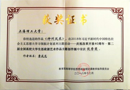 近日,由我校第一屆“初心杯”文創作品大賽組委會報送的學生作品《神州風采》(作者為能動學院學生魯成龍)榮獲教育部高等學校思想政治理論課教學指導委員會組織的慶祝改革開放40周年·第二屆全國高校大學生思政課藝術作品主題創作展“優秀獎”。