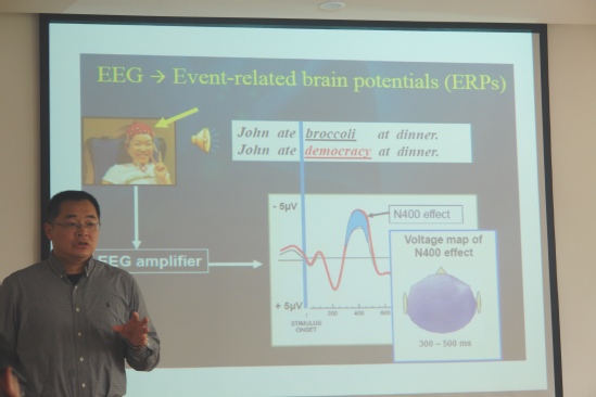 隨后,張輝教授在講座中介紹了ERP研究實(shí)驗(yàn)設(shè)計(jì)的基本知識(shí)及注意事項(xiàng),通過(guò)典型英漢語(yǔ)義加工實(shí)驗(yàn)案例,深入淺出地講解了ERP實(shí)驗(yàn)的不同變量,具體闡述了控制變量和科學(xué)的ERP實(shí)驗(yàn)設(shè)計(jì)方法。隨著張輝教授對(duì)實(shí)驗(yàn)設(shè)備、數(shù)據(jù)分析、實(shí)驗(yàn)設(shè)計(jì)要點(diǎn)等一一講解,聽(tīng)眾對(duì)神經(jīng)認(rèn)知語(yǔ)言學(xué)和ERP實(shí)驗(yàn)有了詳細(xì)的了解。張輝教授鼓勵(lì)外語(yǔ)學(xué)院師生嘗試新的研究領(lǐng)域,多看前沿文獻(xiàn),自己動(dòng)手設(shè)計(jì)并參與實(shí)驗(yàn)過(guò)程,在理論知識(shí)基礎(chǔ)上進(jìn)行實(shí)證研究。本次講座持續(xù)兩個(gè)半小時(shí),由外語(yǔ)學(xué)院副院長(zhǎng)韓戈玲教授主持。