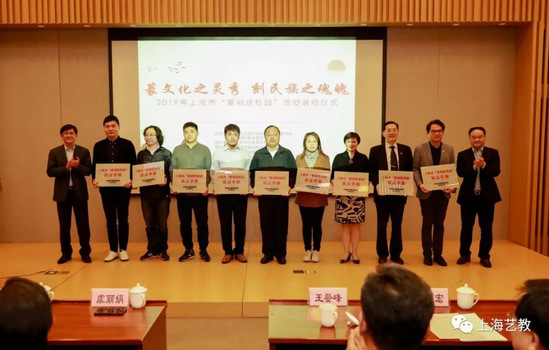 市教委副主任倪閩景和嘉定區副區長王浩為上海市“篆刻進校園”試點學校代表授牌。本次“篆刻進校園”活動在全市共遴選了109所學校作為試點學校,其中試點高校共有6所,我校位列其中。
