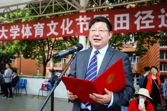 校長丁曉東致開幕詞。他指出,當前正是我校建設高水平大學的關鍵時期,學校將不忘初心、牢記使命,秉承服務學生成長成才的宗旨,著力加強校園文化建設,特別要進一步加快體育課程改革,推動體育社團和陽光體育活動蓬勃開展,不斷培養出德智體美勞全面發展的高素質人才,讓學生朝著更快、更高、更強的目標沖刺,心懷偉大的夢想奔向更廣闊的舞臺。希望通過體育文化節讓廣大師生充分發揮自己的運動才華,盡情釋放對體育的熱愛,享受競爭、拼搏、奮斗、成功帶來的喜悅,并不斷突破自我,追求卓越,以新的更好的成績向新中國成立70周年獻禮。