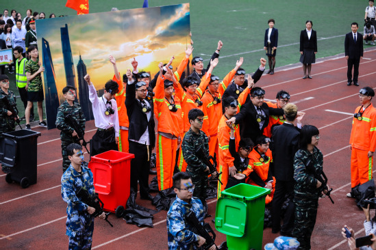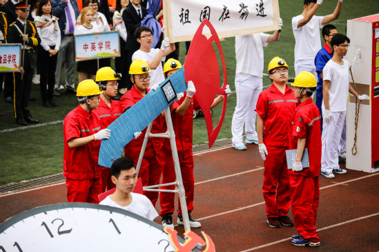 開幕式上,來自學校的19支隊伍在國旗隊的帶領下依次走過主席臺,為大家帶來了別具一格的入場式表演。2019年是新中國成立70周年,各參演方陣也在開幕式中融入了諸多愛國元素:五四青年的學生裝、嘉興南湖的游船、紅軍戰士的沖鋒號等,展現了理工學子熱忱的愛國心。此外各個學院也充分展現了各自的學科特色:3D打印大飛機、免疫系統的三道屏障、5G信號塔等都直觀地表達了學子們對知識的熱情。今年的教工韻律廣播操表演和學生軍體操展演也展現了我校師生良好的精神面貌。