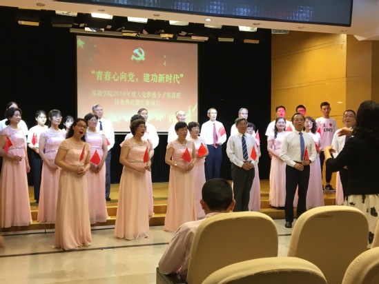 離退休黨委宣講組成員兼特邀黨建組織員張忠賡、邱喜生、蘇金發等老同志為基礎學院2019年度入黨積極分子培訓班作輔導報告,圍繞黨的歷史、黨的章程、黨的基本理論知識、如何做一名合格的入黨積極分子等主題展開,引導學生堅定政治理想、繼承黨的優良傳統、牢記黨的初心和使命,以良好的學風做新時代的建設者。此外,關工委老同志于6月10日參加了“青春心向黨,建功新時代”——基礎學院2019年度入黨積極分子培訓班結業典禮暨匯報演出。老同志參與學生們的節目、與學員們合唱《我和我的祖國》,展現了紅色精神的傳承與發揚,把會場氣氛推向了高潮。