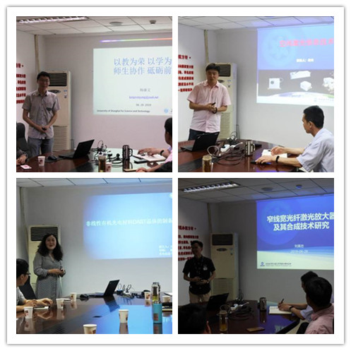 支部共建雙方的研究生導師代表圍繞創新人才培養、研究生代表圍繞科技創新進行了交流。上海理工大學光電學院楊康文副教授作題為《以教為榮,以學為樂,師生協作,砥礪前行》的報告,介紹了自己在教學和研究生培養過程中的具體做法,分享了與研究生合作攀登科技高峰的酸甜苦辣、經驗體會和理性認識。上海光機所高功率光纖激光技術實驗室何兵研究員作題為《空間激光技術及上光所研究生教育》的報告,介紹了上光所空間激光中心三個實驗室的研究方向、研究特色和優勢,并介紹了上海光機所在招生政策、研究生待遇等方面的基本情況。上海理工大學光電學院博士生田甜同學作題為《非線性有機光電材料的制備及應用》的報告,上海光機所高功率光纖激光技術實驗室碩士生劉美忠同學作題為《窄線寬光纖激光放大器及其合成技術研究》的報告。