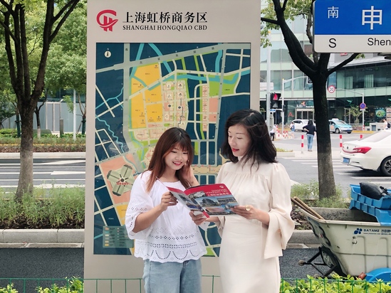 李文嘉在街頭為學(xué)生講解虹橋商務(wù)區(qū)風(fēng)貌規(guī)劃