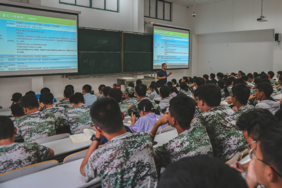 學校歷來重視軍訓新生的思想政治教育,除軍事訓練外,各種理論課程也在同步進行。軍事理論課教學于每周一至周五晚分兩周先后在三個校區進行,由校領導、輔導員、部分職能部門負責人等50人為新生授課,同時邀請國防大學政治學院張鑫和李志剛教授開展專題講座,課程以聽寫說看的形式,從軍事思想、軍事高技術、國防和周邊安全四方面為新生帶來了一場別開生面的軍事知識課堂,今年軍事理論課教學還首次嘗試將新時代中國說(大學生講思政)慕課融入教學內容。接下來,學校還將開設新生認知教育課程,讓新生盡快熟悉學校制度,提升理論素養,堅定理想信念,在軍訓中精進不休。