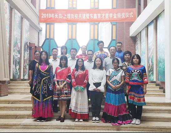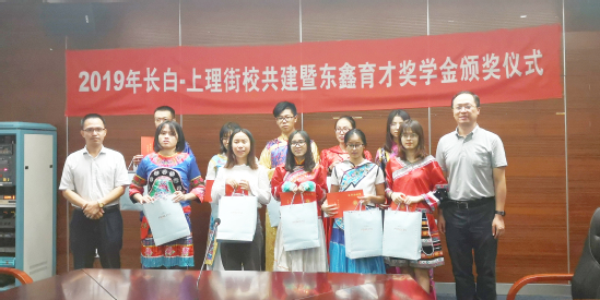 9月23日下午,2019年長(zhǎng)白-上理街校共建暨東鑫育才獎(jiǎng)學(xué)金頒獎(jiǎng)儀式在圖文信息中心第二會(huì)議室舉行。上海東鑫電力工程安裝有限公司黨支部書(shū)記盧惠民、長(zhǎng)白新村街道黨工委副書(shū)記吳君隆、我校教育發(fā)展基金會(huì)主任孟寶全出席。10位今年?yáng)|鑫育才獎(jiǎng)學(xué)金獲獎(jiǎng)學(xué)生著各自民族服裝出席。會(huì)議由學(xué)生處副處長(zhǎng)、學(xué)生資助管理中心主任謝錫浩主持。