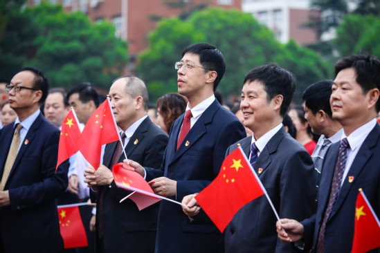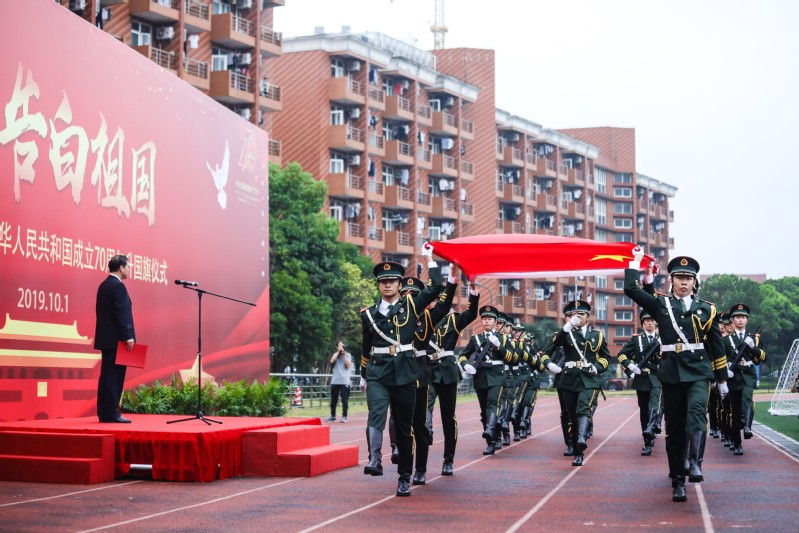 上午7點30分,鮮艷的五星紅旗在校國旗護衛隊同學英姿颯爽地護衛下入場,伴隨著雄壯的國歌聲冉冉升起,參加儀式的全體人員肅然而立,行注目禮。國旗下,大中小學生代表為中華人民共和國成立70周年獻詞,把贊美與祝福獻給心中最敬愛的偉大祖國,學生代表向老同志獻花,感謝他們與祖國共同奮斗的青春歲月。