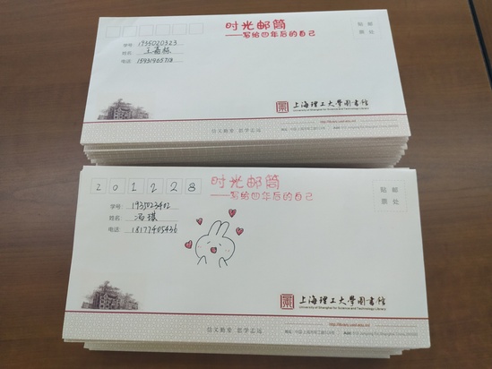 本次活動是圖書館開展的“明志·夢想·初心”2019讀書推薦系列活動之一,以“寫給四年后的自己”為主題,在校本部圖書館一樓大廳和軍工路1100號校區圖書館2樓設立郵筒,同時圖書館也為同學們準備了專用的信封和信紙,寫完信后同學們自由投遞到郵筒中,本次活動共收到了一百余封信件。圖書館整理并封箱保存這些寫好的信件,到2023年的畢業季,根據姓名、學號發放信件。