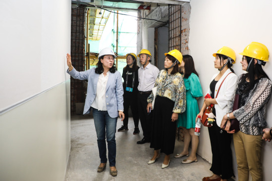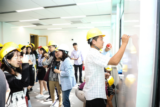 為了能及時聽到師生們的反饋,教務處、基建處、信息辦等部門負責人擔當起樣板間“解說員”,現場介紹設計亮點、使用方法、備選方案等,單就一個樓道的墻壁就小范圍做了“常規款”“浮雕款”兩種風格讓師生對比參觀選擇。