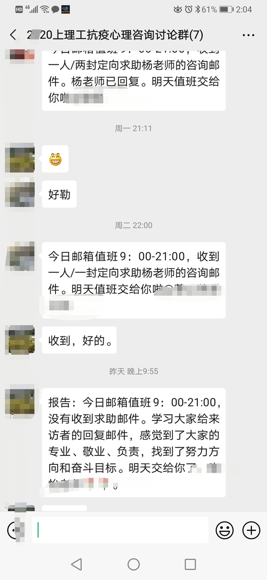 收到決定組建上海市級層面抗擊疫情心理援助中心工作組的通知后,兩位老師立馬報名參加,并在第二天就開始學習大量資料,進行準備,隨后在學校開通了上海高校面向社會開放的第五條抗擊疫情心理支持熱線。在這段時間里,每天都會有5到6個電話打進熱線,熱線咨詢師們曾為壓力大的基層工作人員排憂解難,也給擔心學業進度受阻的同學們吃下“定心丸”……對于每一個電話,楊颎都要了解咨詢情況、提出改進意見、總結經驗。此外,楊颎與陳峰還承擔著全國心理援助郵箱的郵件咨詢服務?!拔液完惙謇蠋煻际屈h員,也是老搭檔,當初在報名的時候,我們沒有猶豫,可能就是源于心里的那份‘使命感’吧!我們知道什么時候能檢驗專業水平,什么時候要勇于承擔社會責任,只要能夠讓大家振作起來,不管什么時候我們都愿意站出來!”楊颎說道。