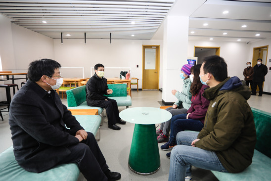 在第一教學(xué)樓,校長丁曉東與師生們一同在線觀看了戰(zhàn)“疫”公開課,在線查看全校在線教學(xué)的實時運行情況。隨后,校長丁曉東與教師代表簡要交流在線教學(xué)相關(guān)情況。
