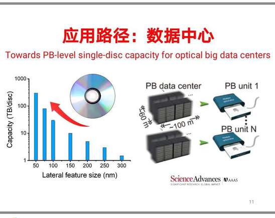 這是一項旨在解決海量大數據光存儲技術瓶頸的研究,此研究通過鑭系元素(稀土元素之一)摻雜的熒光上轉換納米顆粒和氧化石墨烯結合,實現低功率的光學寫入納米級信息位(納米級是指1至100納米的大小,其中1納米等于1米的十億分之一),為下一代光信息存儲技術提供了新的方案。研究所開發的亞衍射光學寫入技術將大大提高數據密度,可以生產出在所有可用光學技術中具有最大存儲容量的光盤,預計1張12厘米的光盤數據存儲量可以達到700TB,相當于28000張藍光光盤的存儲量。