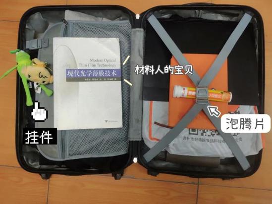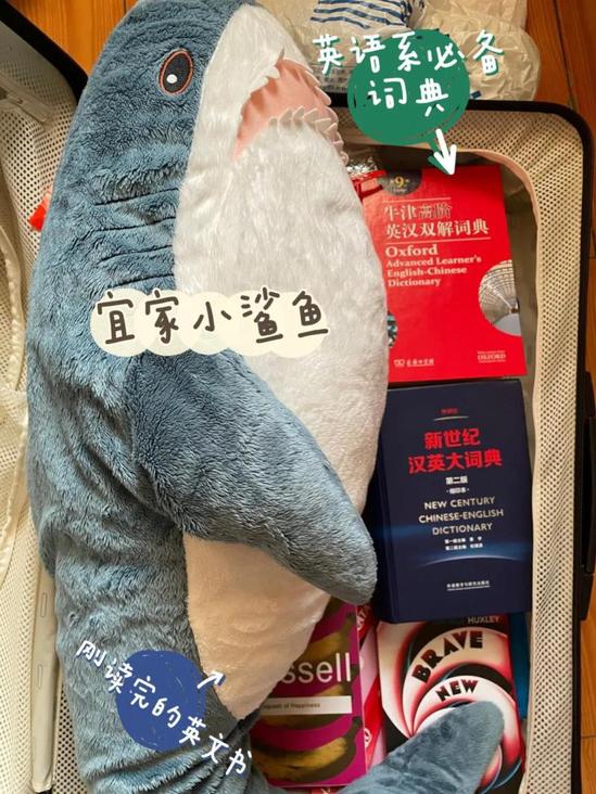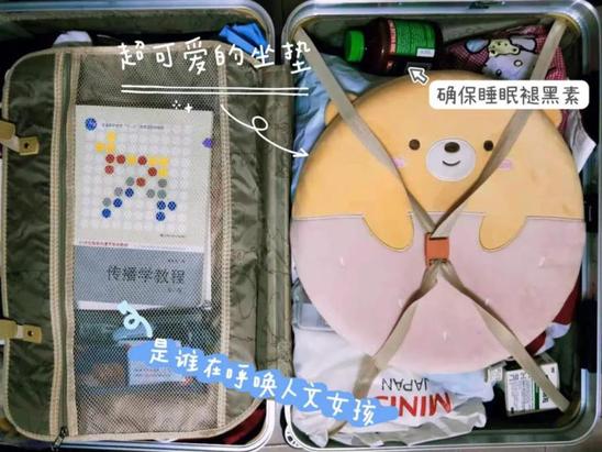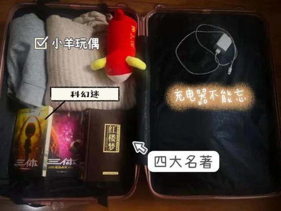 可能是因為這個不得不更“宅”的非常時期,大學生行李箱除了大部頭的書籍還有不少毛絨類的玩偶相伴。隨機開箱發(fā)現(xiàn),箱子1的主人將宜家小鯊魚、英漢雙解和漢英大詞典都裝了箱;箱子2屬于另一位理工學子,不僅有《現(xiàn)代光學薄膜技術》這樣的專業(yè)書籍,還有小萌物卡通掛件,以及一罐VC泡騰片,顯得頗為“愛人愛己”;箱子3的小主是傳播學“人文女孩”,不論回家還是回寢室都要帶上一個超可愛的小熊形象坐墊,而且裝備了一瓶確保睡眠質(zhì)量的褪黑素,絕對比理工男更養(yǎng)生呢。