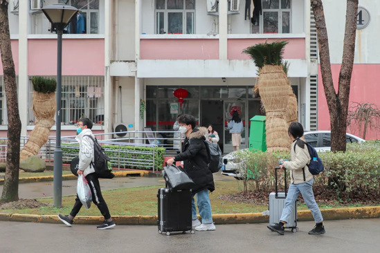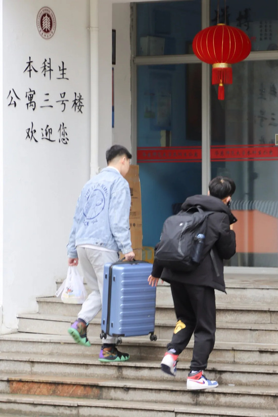 申城春雨綿綿,上海杉達學院學生分批分院返校報到,大包小包的不說,還要騰出一只手撐傘。記者在浦東校區(qū)門口看到,返學學生憑校園卡、健康碼綠碼,以及入校回執(zhí)進入校園,在校門口還要進行體溫檢測,行李消殺后才可入校。其間,身穿紅馬甲的志愿者們套著雨衣,幫返校生把行李送到宿舍樓,前來送一程的家長放心了不少。