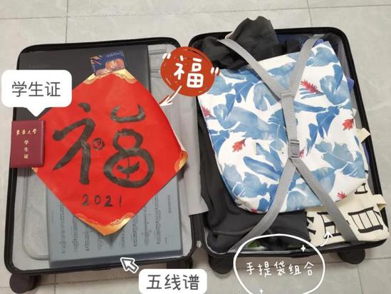 心愛之物,隨身攜帶。東華大學材料學院大二學子裴爽的行李箱里,藏著五線譜。她背上吉他,繼續(xù)愛音樂。有意思的是,她還把東華的“福”字貼裝進箱子里,而且“福”字的右半部分帶著牛角,“人到‘福’也到了!”