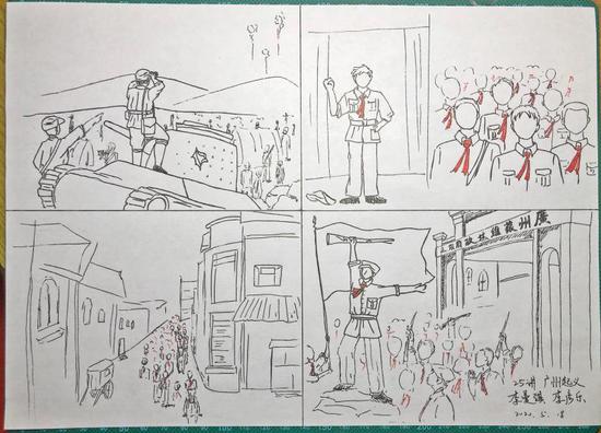 盡管理工科學生的美術基礎相對薄弱,但是這一創新的黨史學習教育卻吸引了200余名同學主動報名參與。“是時候展現真正的技術了。”“誰說理工男不夠文藝范兒。”接到任務時,同學們一邊調侃著,一邊摩拳擦掌認真籌備著。“開始創作的時候還處于新冠疫情防控嚴峻的時候,同學們都身在各地暫未返校,老師就讓我們用線上學習和線下繪畫、個人自學和集體創作相結合的方式開展。”生物醫學工程專業研究生林清晶回憶道,“我們自發組成學習小組,線上分享交流學習體會,一起精煉黨史故事的核心內容,形成漫畫作品的文字腳本,最終通過手繪或電腦軟件創作的形式,‘還原’我們心中的黨史經典場面。”