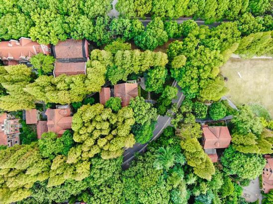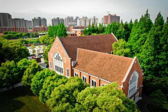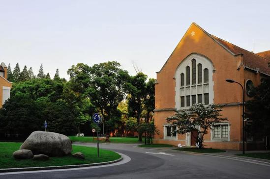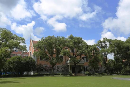 校門正對著的是以滬江大學(xué)首任華人校長名字命名的“湛恩大道”,沿著大道前行,便來到了一片環(huán)境清幽、植被茂密的區(qū)域,樹叢間還可看見紅瓦屋頂與紅磚墻面。