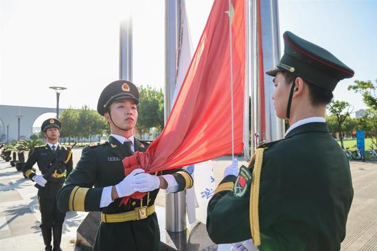 只見升旗手們護(hù)衛(wèi)著鮮艷的五星紅旗入場,他們著裝整齊、步伐矯健。現(xiàn)場師生在會(huì)林廣場前整齊列隊(duì),伴隨著雄壯的《義勇軍進(jìn)行曲》響徹校園,向鮮艷的五星紅旗致以莊嚴(yán)的注目禮,共同為祖國送上誠摯的生日祝福,也為中國共產(chǎn)黨成立100周年獻(xiàn)禮。