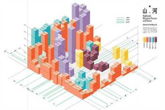 作品《紅軍長征行軍速度圖》和《紅軍長征所歷經的高山河流》就把長征路程上人們難以想象的種種困難,用可視化數據清晰地揭示出來。地圖上,黃色的圓點代表當天行軍到達的地點,并標明停留的日期。圓點上方的每一個粉色小圓點代表10公里的里程,有時候為了強行軍,戰士們要忍受饑寒,在崎嶇的道路上一天一夜行走一百多公里。況且,長征的旅程經過的大部分地區自然條件都十分艱苦,這些高原、雪山相比于我們熟悉的風景名勝,海拔要遠遠高得多。這些數據的圖形化展現,更容易讓觀眾建立直觀的想象,體會先輩們革命精神的頑強和偉大。