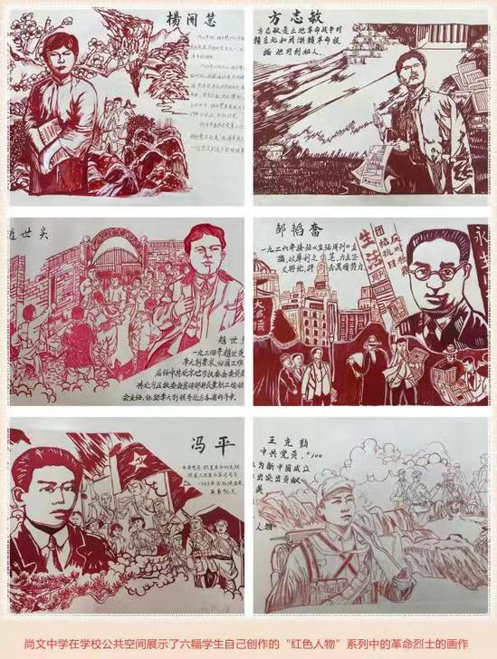 在尚文中學,今天展示了多幅由學生繪畫的革命烈士肖像作品。此前,學生們通過走近烈士事跡、聆聽烈士故事、挖掘典型示例、記錄關鍵場景,遴選出了一批革命烈士的繪畫素材。