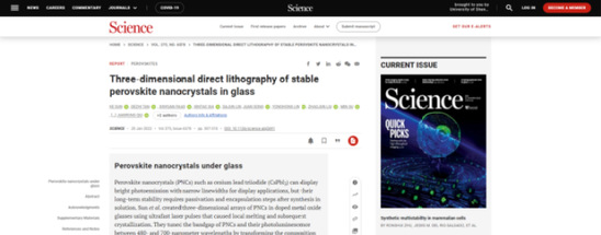 研究成果以《玻璃中穩定的鈣鈦礦納米晶體三維直寫》(Three-dimensional direct lithography of stable perovskite nanocrystals in glass)為題發表在《科學》正刊,論文共同第一作者為浙大光電學院博士生孫軻、之江實驗室PI譚德志、上海理工大學副教授方心遠。