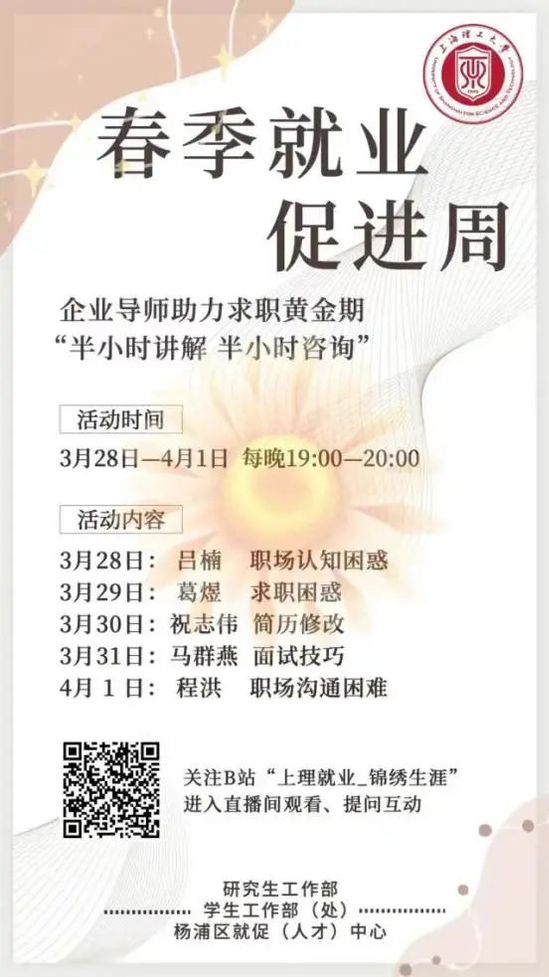 為切實幫助更多的2022屆畢業生完成求職擇業人生大事,上海理工大學聯合楊浦區就促(人才)中心舉辦2022年“研職在線”就業促進周活動。活動邀請5位資深企業導師,以“半小時講解,半小時咨詢”的方式,助力學生順利就業。導師們通過回復彈幕、連麥的方式,為學生提供咨詢,并達到了一人咨詢,多人收聽受益的效果。