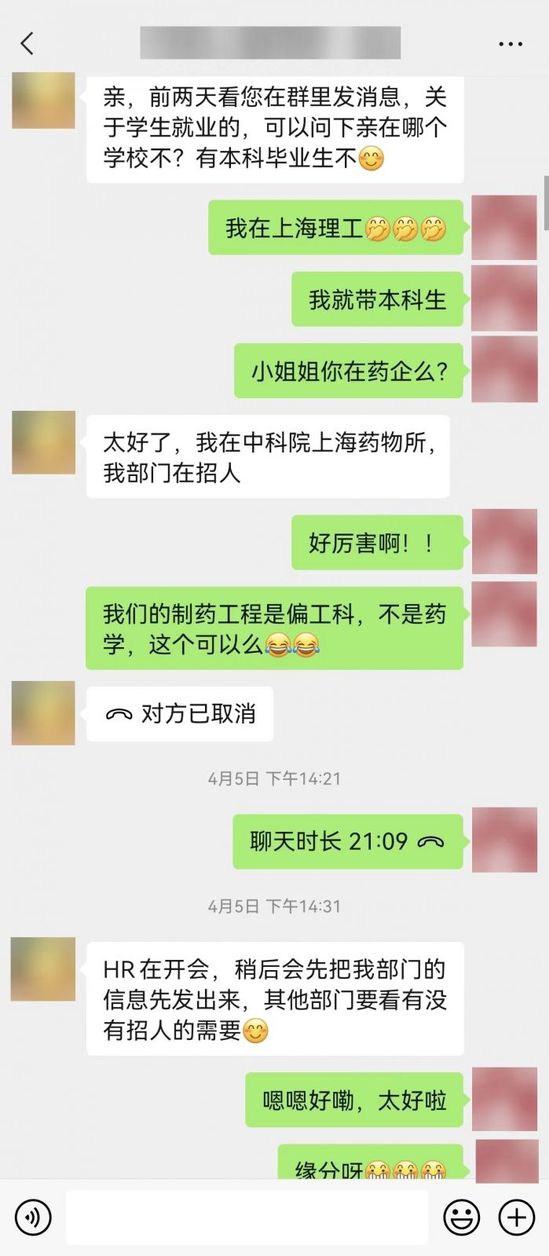 作為拋出“橄欖枝”的鄰居之一,徐白與朱旭平時(shí)只是“點(diǎn)頭之交”,看到群內(nèi)的消息后,就職于中科院上海藥物所藥物安全評(píng)價(jià)研究中心的她立即加了朱旭好友,在確認(rèn)了畢業(yè)生的教育背景等基本情況后,反饋給研究中心的人力資源部門,幾天時(shí)間就促成了后續(xù)的線上面試等招聘流程。