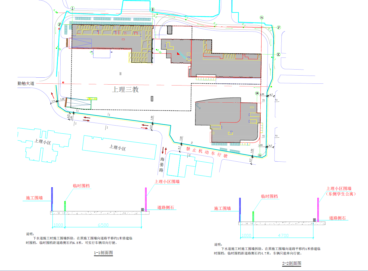 受項目建設影響,需對原施工圍墻陸續進行拆除,做臨時圍擋隔離,對周邊校園道路將產生一定影響,部分道路變窄,部分道路禁止機動車行駛。預計施工時間為2023年11月21日起至2023年12月30日。詳見附圖: