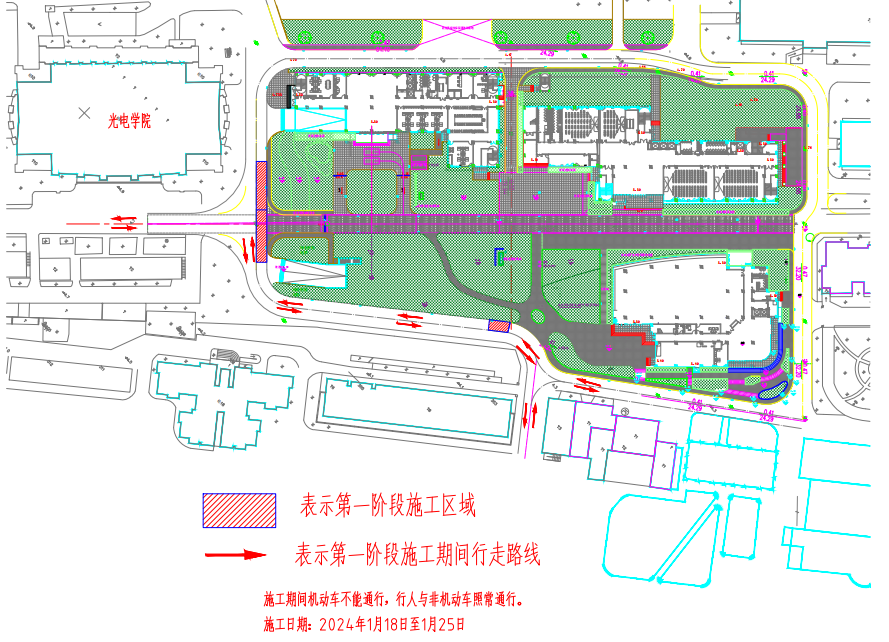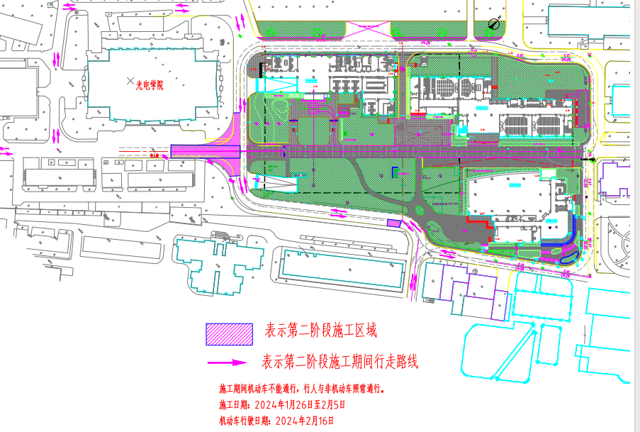 我校軍工路516號校區改擴建工程教學樓標段正在室外總體施工,計劃開始道路施工,屆時將封閉勤勉大道局部道路(光電學院門前東側),為保證行人通行,該區域施工將分為兩個階段(見附圖):第一階段施工日期為1月18日至1月25日(混凝土道路養護時間至2月5日),第二階段施工時間為1月26日至2月5日(混凝土道路養護時間至2月15日)。第二階段施工時間內,請需到達勤勉大道以南校園區域及四公寓、五食堂的機動車從軍工路516號大門駛入,請需到達圖書館方向的機動車從軍工路580號大門駛入,光電學院西側繞行。