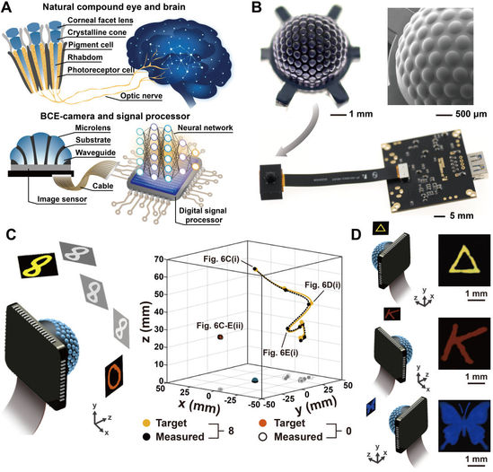 昆蟲通過成百上千個“子眼”協同工作,實現對復雜環境的即時響應。團隊模擬這一結構,設計出一套0.8立方米厘米的仿生視覺系統,實現了百萬像素級的全彩超大視野(165°×360°)高清成像。更重要的是,他們不僅“模仿”昆蟲的視覺系統,還利用AI為其賦能。