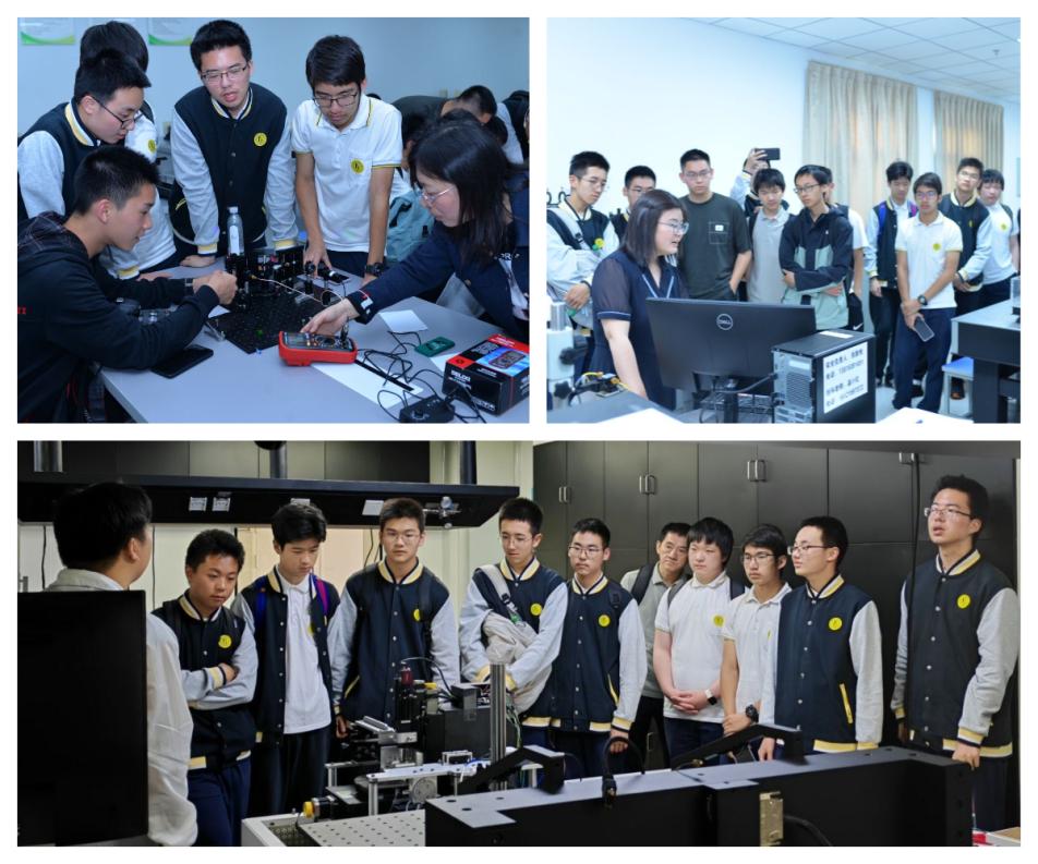 下午,科技節活動接待了上海市控江中學“致海書院”學生研學實踐活動。同學們聆聽了“追光一甲子,拳拳報國心”未來光學科學家精神報告和“光的波粒傳奇——從微粒波動之爭到太赫茲技術前沿”科普講座后,進入本科實驗教學中心。在韓朝霞老師的帶領下,他們初識光譜技術,用光學元件搭建簡易的掃描式光譜儀,直觀認識了光譜儀的組成和原理,并觀察到七色光譜。溫小紅老師展示的生物芯片檢測實驗,通過沉浸式操作體驗,讓同學們了解到生物傳感器在老年疾病早篩和動態監測中的關鍵作用。隨后,同學們來到上海理工大學太赫茲技術創新研究院,參觀了研究生們正在進行的科研項目。他們認真聽講、積極提問,在交流中不斷碰撞思維火花。