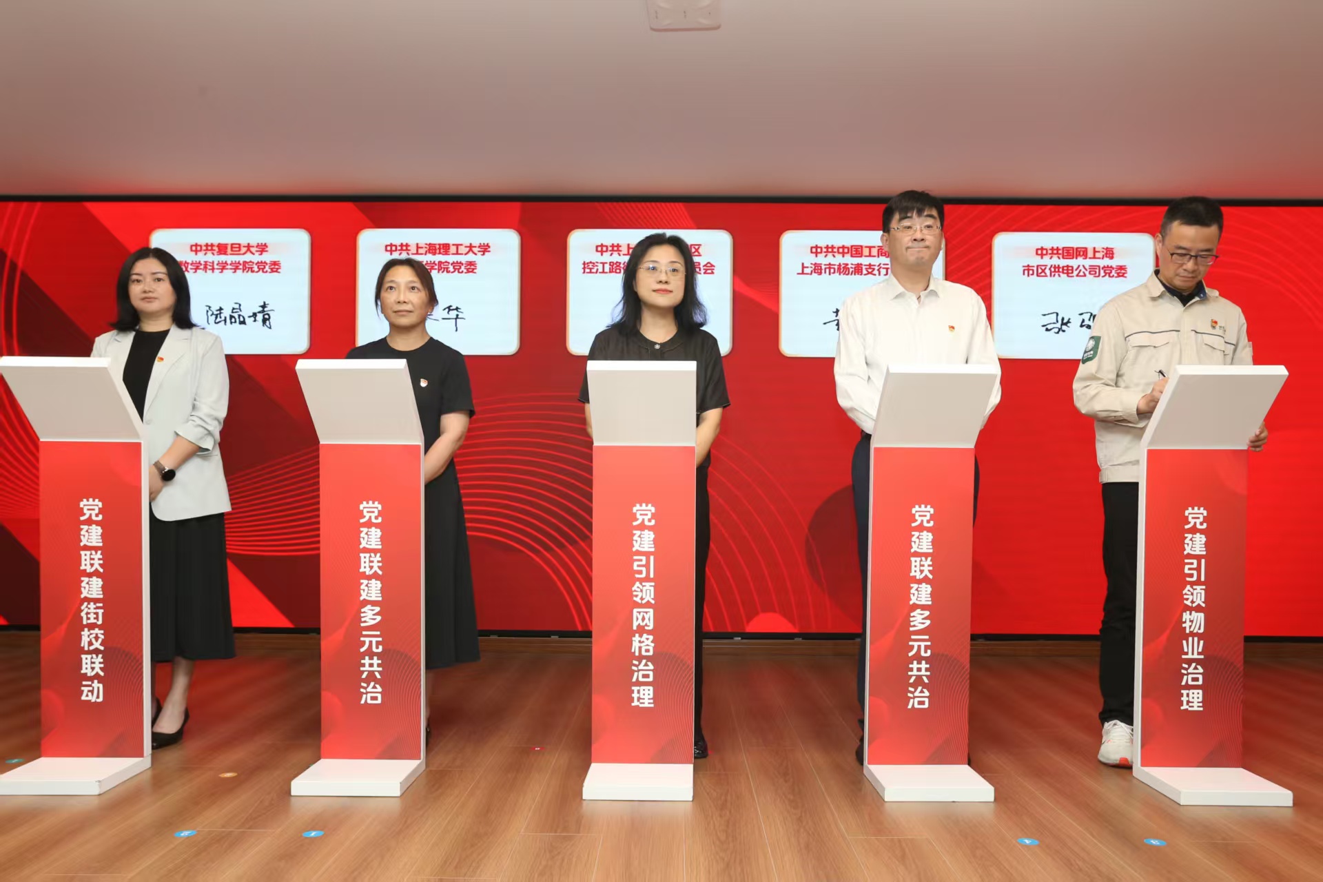 我校出版學院黨委與復旦大學數學科學學院黨委、國網上海市區供電公司黨委、中國工商銀行上海市楊浦支行委員會和控江路街道黨工委等五家單位黨組織代表共同簽署黨建聯建協議。