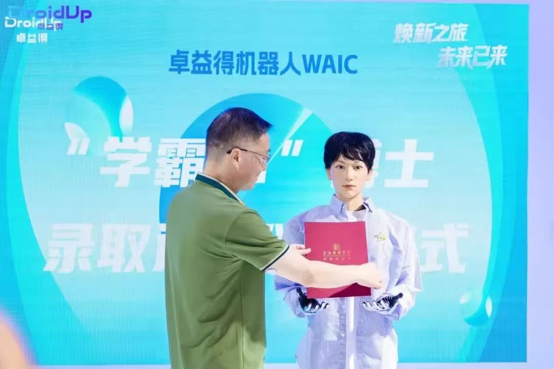 近日,在2025世界人工智能大會現(xiàn)場,由上海理工大學李清都教授團隊研發(fā)的卓益得“行者二號”優(yōu)化版機器人“學霸01”,接過上海戲劇學院的紅色錄取通知書,被錄取為上海戲劇學院戲劇與影視(全日制)專業(yè)2025級新生(博士,學制四年),成為全國首位以“博士”身份入學的具身智能機器人。