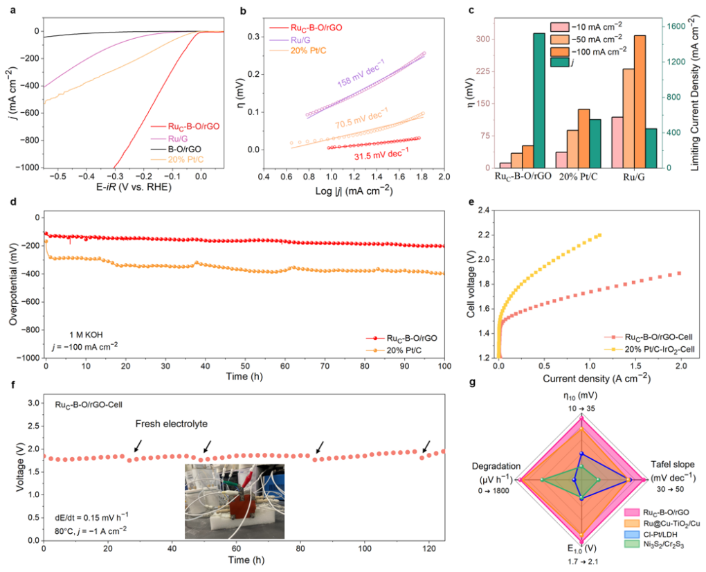 以上方案有效解決了電解水產氫技術成本高、效率低和循環壽命短的核心難題,實現了催化劑成本降低至25%,產氫效率提高了約13倍和連續循環運行100h無衰減的功效。此外,通過引入鎳原子摻雜二氧化釕和氧化鈷異質結構設計(圖1),進一步降低了催化劑的過電位(η10 =195 mV)并提高了釕的溶解保持率(100 mg/cm2電流密度下循環20小時,保持率高達94.1%),實現活性與穩定性的統一。在模擬實際工況AEMWEs測試中,催化劑在產氫電流密度為1 A/cm2時的電位僅為1.73 V,且釕貴金屬的載量僅為0.1 mg/cm2,綜合性能優于2024年美國能源部的具體要求(圖2)。
