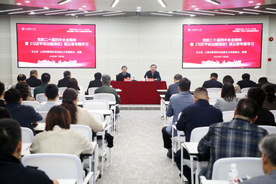11月5日下午,上理工舉行黨委理論學(xué)習(xí)中心組(擴(kuò)大)學(xué)習(xí)會暨職能部門負(fù)責(zé)人培訓(xùn)班輔導(dǎo)報告,上海市委黨校馬克思主義學(xué)院院長王公龍教授受邀做“黨的二十屆四中全會精神暨《習(xí)近平談治國理政》第五卷專題學(xué)習(xí)”輔導(dǎo)報告。報告會由校長朱新遠(yuǎn)主持,全體校領(lǐng)導(dǎo)、中層干部參會。