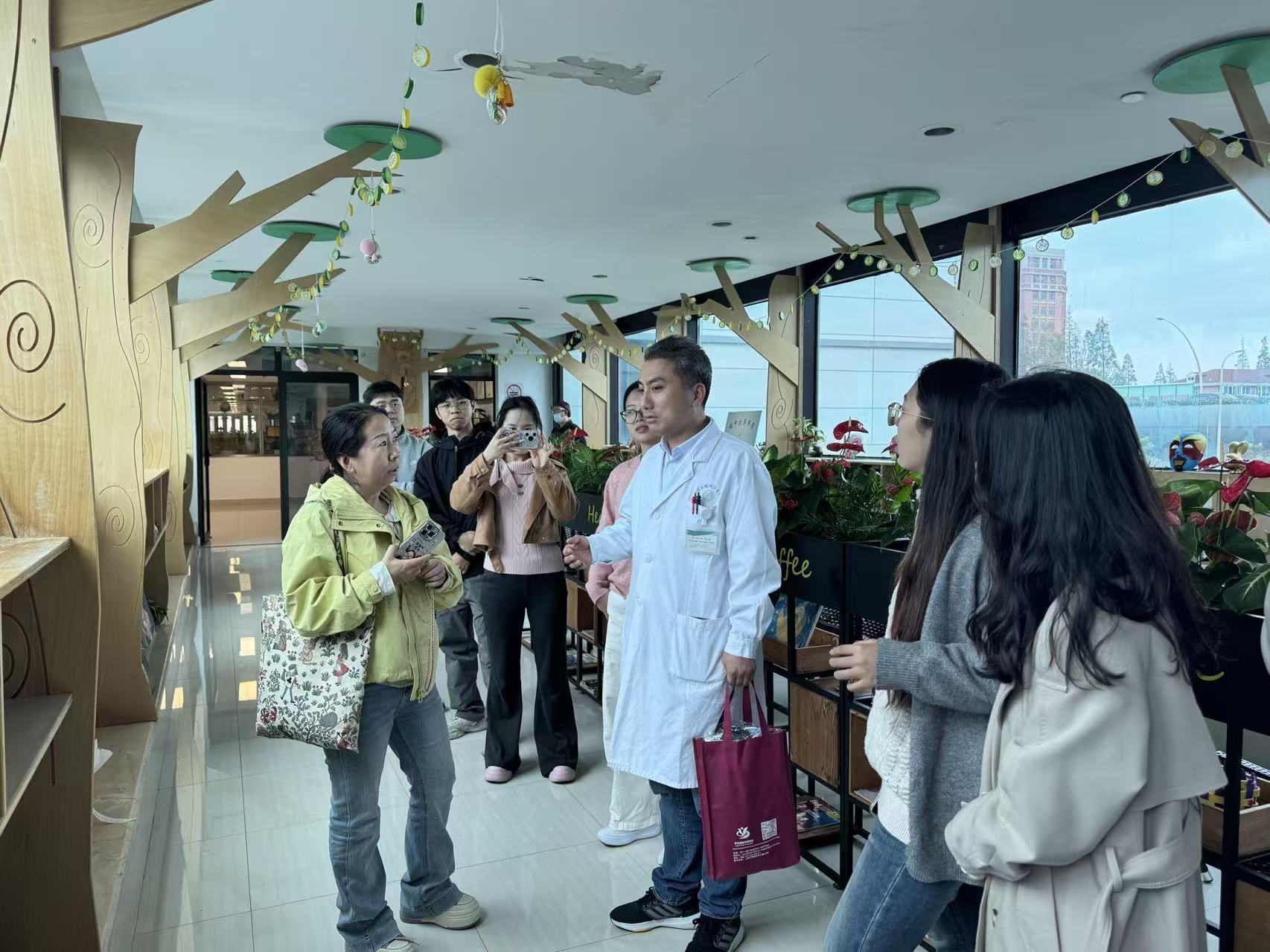 在楊浦區精神衛生中心李斌醫生的專業講解下,師生參觀了醫院住院部、門診診療區及特色康復區域。醫院精心打造的"文化展廳"成為參觀的亮點,展區內陳列的患者創作——包括國風面具、書法作品及色彩鮮明的繪畫,展現了精神障礙患者在藝術表達中的情感世界與創造力。在康復治療區,師生們看到患者參與的團體康復活動,也看到了來自病愈志愿者們在咖啡吧流暢的制作過程。現磨咖啡與手工奶茶的香氣營造出溫馨舒適的氛圍,不僅體現了現代精神衛生服務的進步,也打破了公眾對精神醫療機構的傳統認知,彰顯了“以患者為中心”的康復理念。