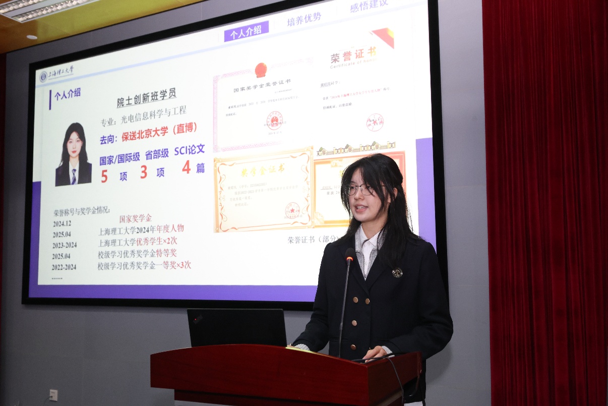 來自往屆的優秀學生代表分享了自己在院士創新班的學習經歷、科研收獲與感悟。第四屆學生代表黃昭鳳向分享了從“主動聯系教授加入課題組”到“從1到2實現創新突破”的成長路徑;第五屆學生代表陳嘉銘以“從渴望優秀走向實現優秀”為主題,講述了參與多項競賽的心路歷程,強調了充分準備和沉著應戰的重要性;新生代表郭旸表達了對院士創新班的向往與期待,并代表全體新生承諾將潛心學問、攜手共進、志存高遠。